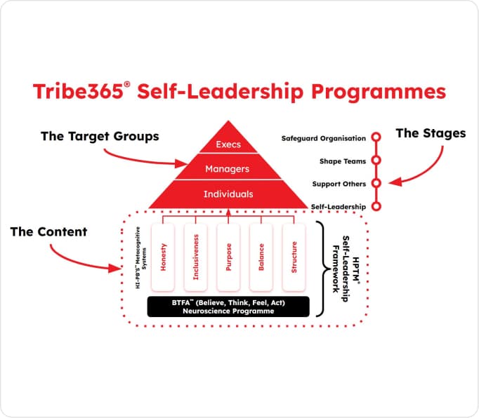 The Tribe365® Self-Leadership programme consists of the content, the stages and the target groups: